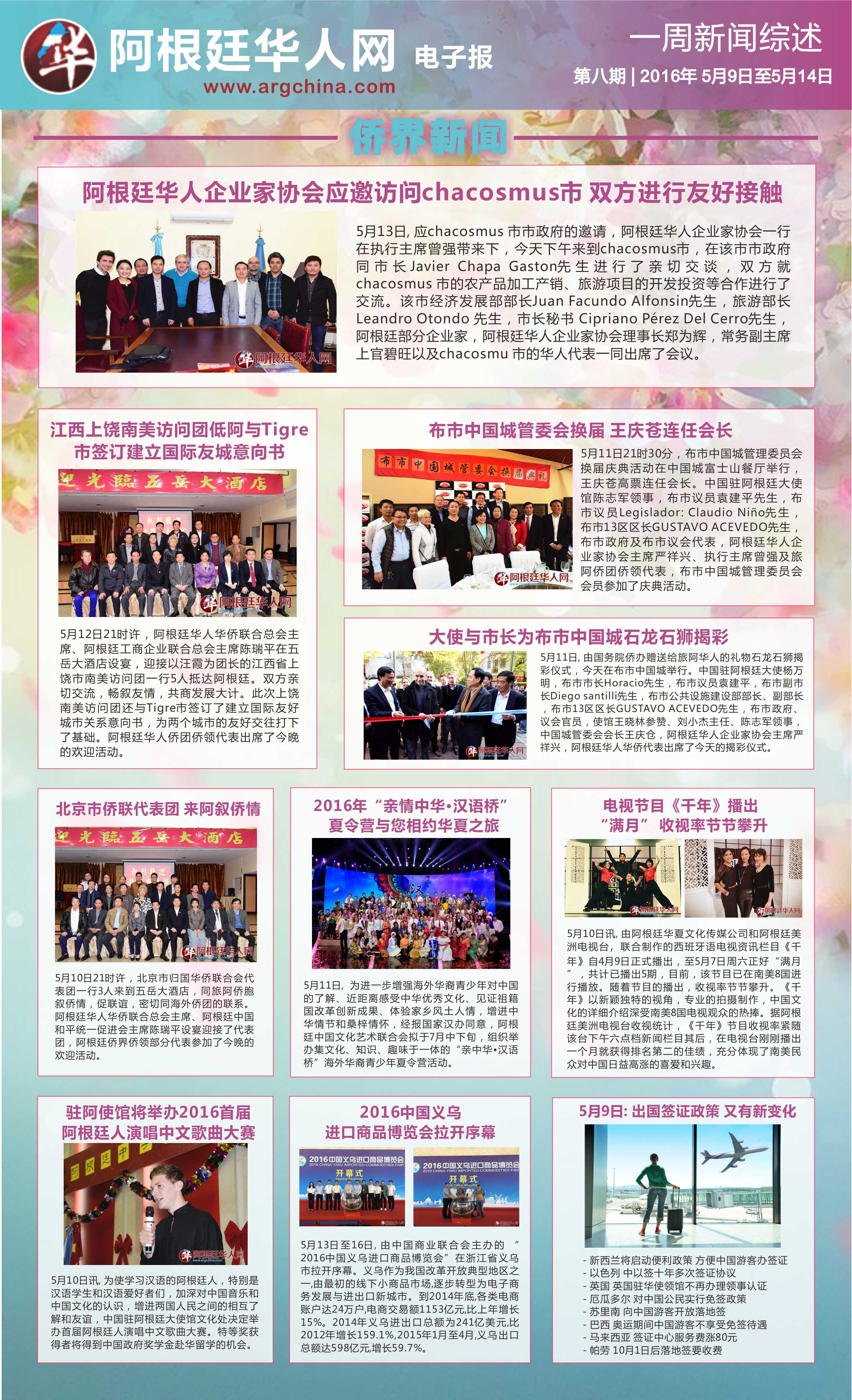 《阿根廷华人网电子报》第八期 侨界新闻 • 2016-05-14 18:45• 收藏本文 9rP阿根廷华人网 转载本网稿件,原则上需要书面授权,不得篡改稿件主题。本网随时有权要求第三方停止侵权行为。 本网所载内容或图片,若涉及侵权,请联系删除。 14 ___________ 2016/05 《阿根廷华人网电子报》第八期 9rP阿根廷华人网 [ 微信长按识别二维码或扫码查看分享内容 ]