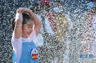 7月24日,一名小女孩在北京华熙LIVE·五棵松商业街区的一处喷泉戏水。新华社记者 陈晔华 摄