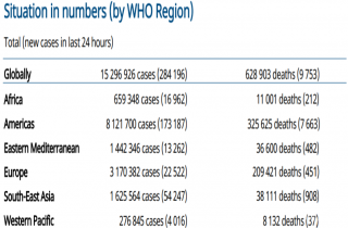 当地时间7月24日,世卫组织发布最新一期新冠肺炎每日疫情报告,全球新冠肺炎新增284196例,死亡新增9753例。疫情最为严重的美洲区域确诊病例达到8121700例(新增173187例),死亡325625例(新增7663例)。