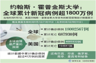 新华社纽约8月2日电 美国约翰斯·霍普金斯大学2日发布的新冠疫情统计数据显示,截至美国东部时间2日21时34分(北京时间3日9时34分),全球累计确诊病例达18002567例,累计死亡687930例。