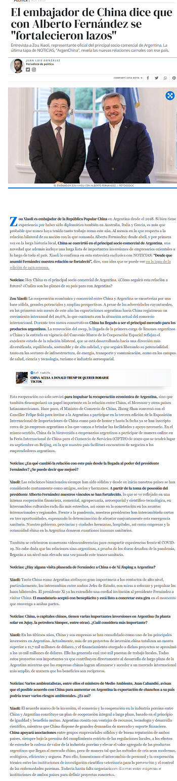 近日,驻阿根廷大使邹肖力接受阿根廷主流媒体《侧影报》专访,重点介绍当前中阿关系、抗疫合作和各领域务实合作情况。专访内容于8月13日在该报发表。