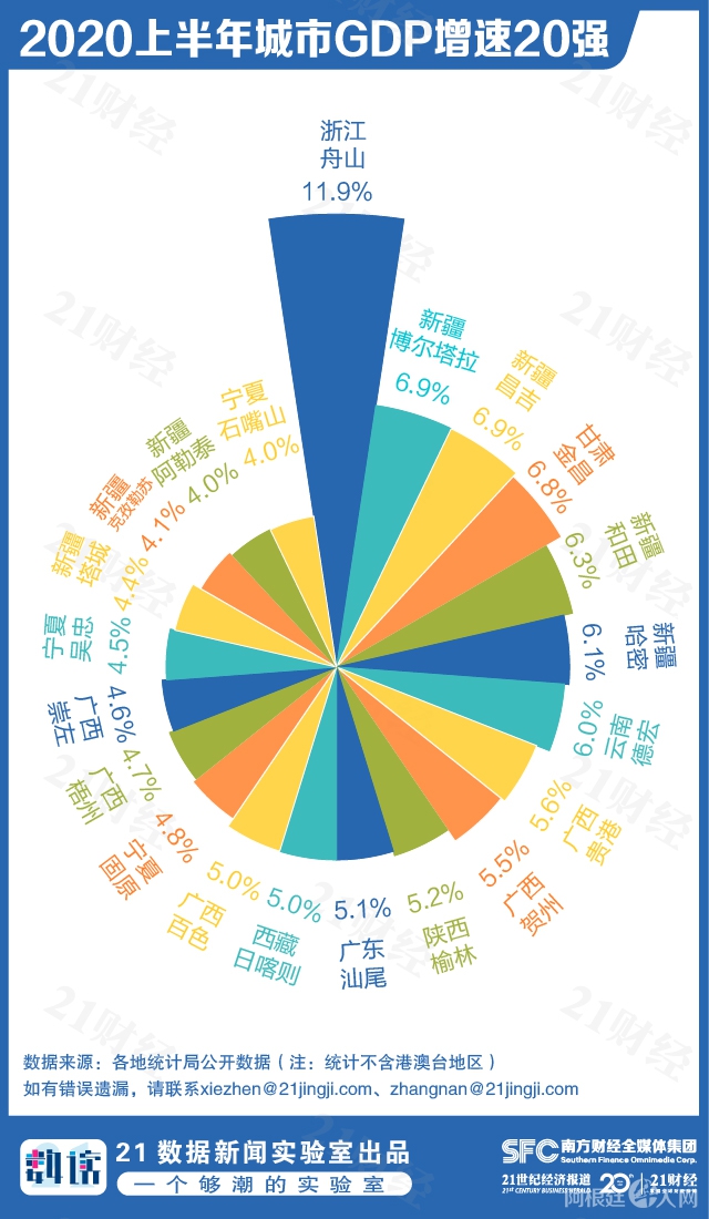 浙江舟山上半年GDP同比增长11.9%,遥遥领先于其他城市。其余20个GDP增速超过4%的城市中,除广东汕尾外其余均来自西部地区,广西、新疆占据6成。