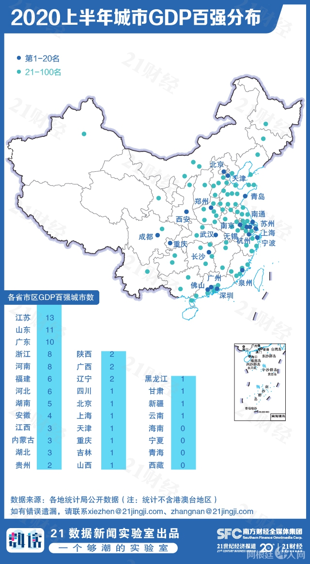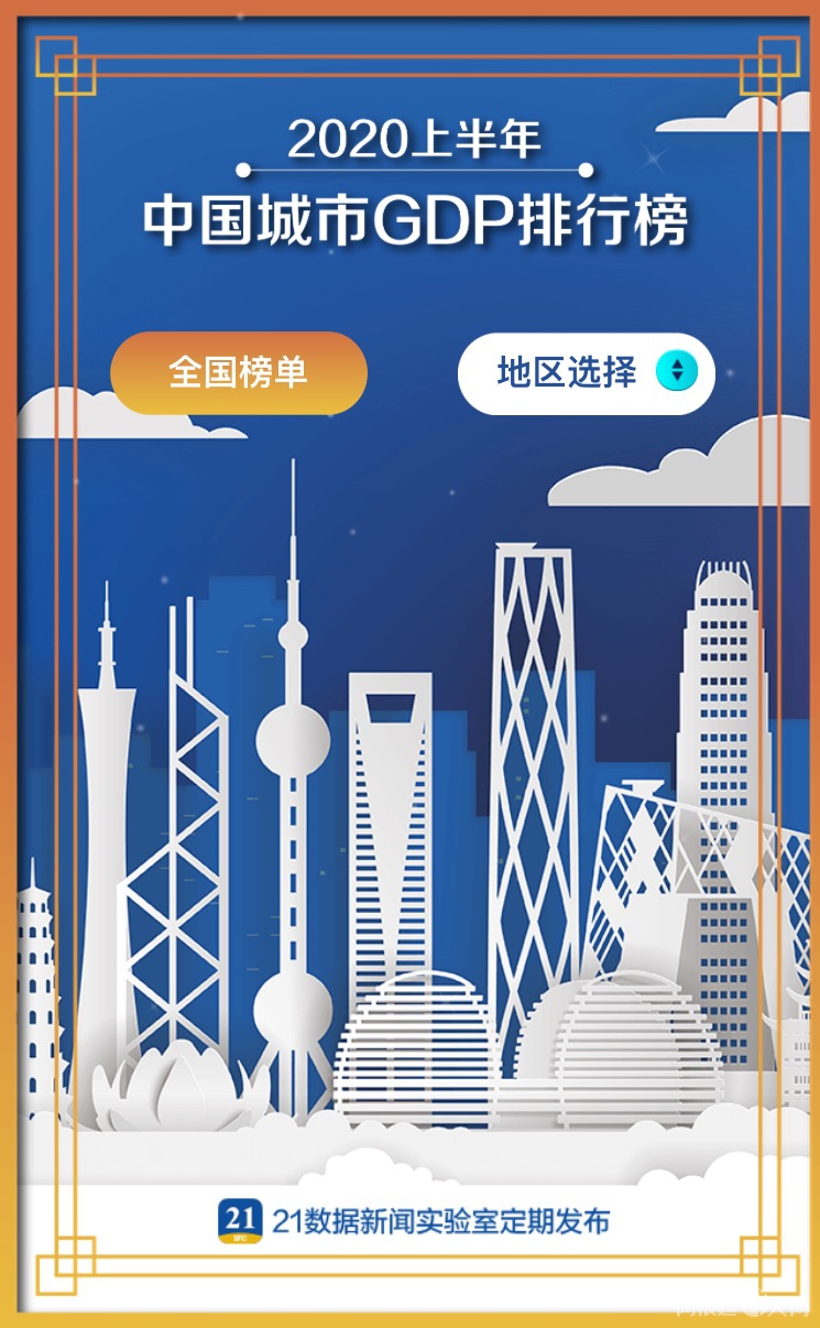 21数据新闻实验室统计338个城市(包括州、地区、盟,港澳台未计入,下文皆以城市统称)上半年经济数据,得出“2020年上半年城市GDP百强榜”。(点此H5查询器>>>最新中国城市GDP排行榜:你的家乡排第几?)