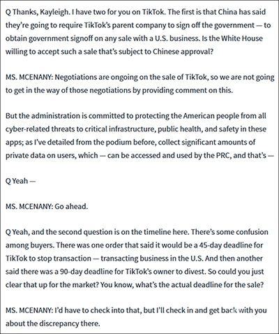 而在交易期限的问题上,麦克纳尼也是含糊其辞。这名记者提及,目前美国政府有两项行政命令限制了交易期限,但一份给出的期限是45天,另一份却是90天,他询问到底应该以哪一个期限为准。
