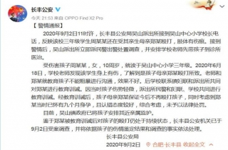 通报指出,2020年9月2日11时许,长丰县公安局吴山派出所接到吴山中心小学校长电话,反映该校三年级学生周某某还在受其亲生母亲郑某殴打,肢体有伤痕。接到警情后,吴山派出所立即派民警出警处置调查,并安排学校老师先带孩子到诊所医治。