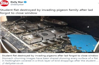 中新网9月4日电 据台湾联合新闻网报道,由于新冠疫情蔓延,多国学校均已关闭多时。此前于3月,英国一名大学生在离开宿舍时,忘记将窗户关好。5个月后,宿舍工作人员听到房间里传出异响,才发现房间惨被鸽群入侵,室内到处是鸽粪,令人惨不忍睹。