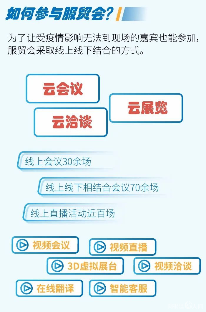 为了让受疫情影响无法到现场的嘉宾也能参加,服贸会采取线上线下结合的方式。“云会议”,“云展览”“云洽谈”成为这次服贸会的重要特色。