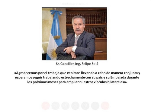 2020年9月9日,驻阿根廷大使邹肖力线上出席中国外交部向阿根廷外交部捐赠抗疫物资交接仪式并致辞。阿根廷外交部外长办公室主任查韦斯大使致辞并转达阿根廷外长索拉的书面致谢。阿根廷外交部对外协调和规划国秘亚涅斯、对外政策副国秘加比隆多、双多边经济谈判副国秘梦海韵、亚大司长、信息技术司司长、亚太经济关系司长以及阿根廷驻华使馆和驻上海、广州、香港总领馆代表等出席活动。