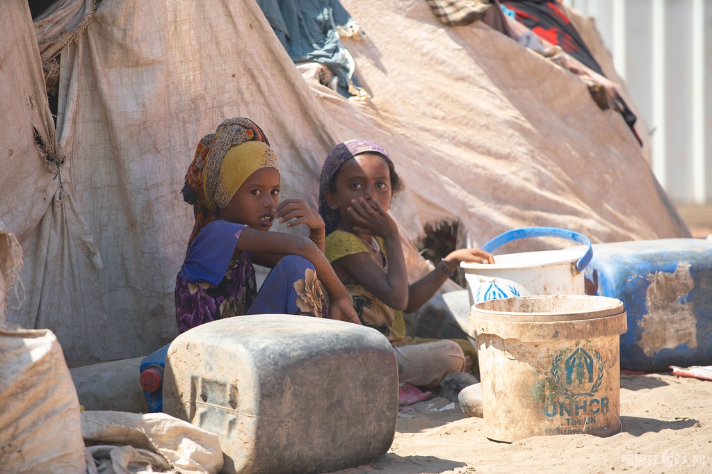 资料图:2019年2月26日,也门儿童坐在一个的流离失所营地中。图片来源:联合国官网 儿基会图片Saleh Baholis