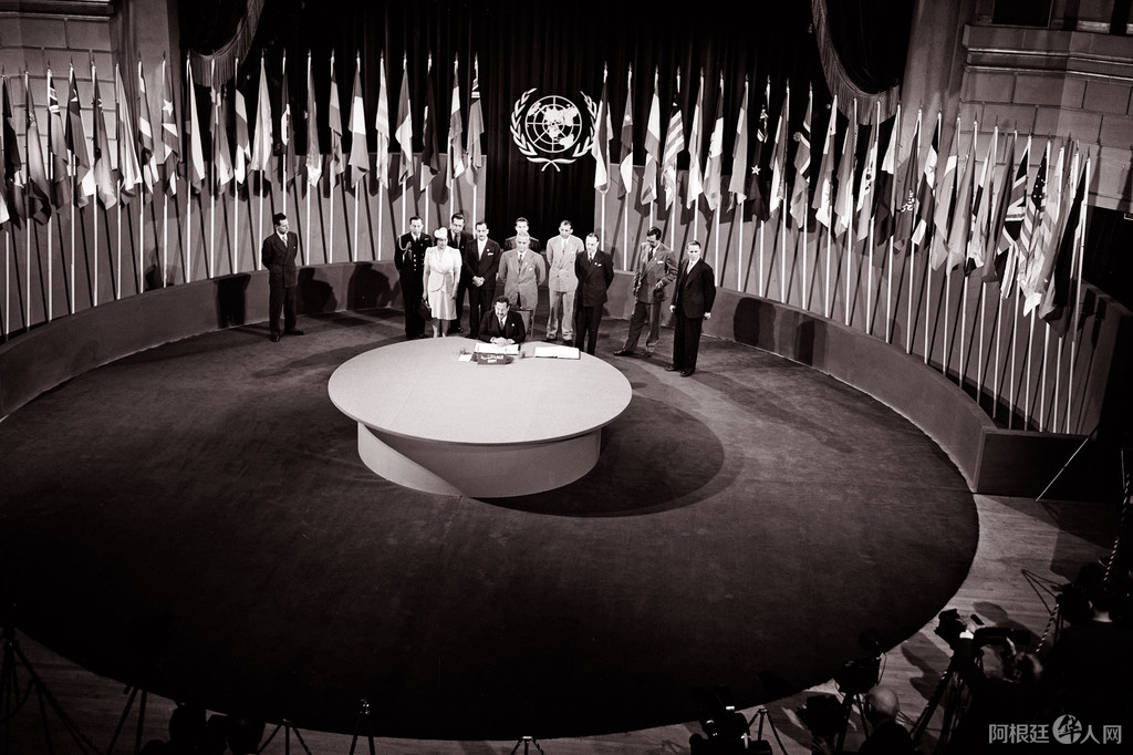 1945年6月26日,《联合国宪章》签字仪式在美国旧金山“老兵战争纪念馆”举行。图片来源:联合国官网 联合国图片Yould