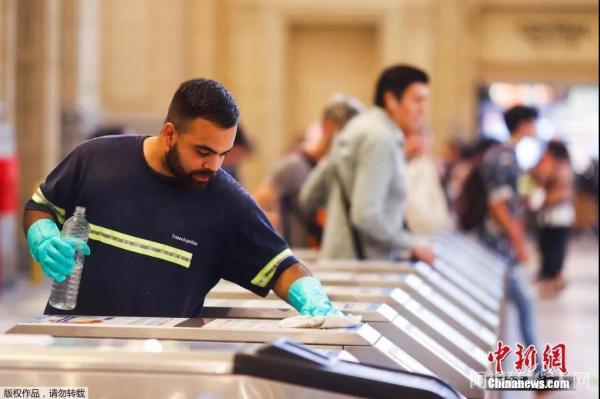 在阿根廷首都布宜诺斯艾利斯的宪法火车站,一名工作人员正在清理刷卡机。