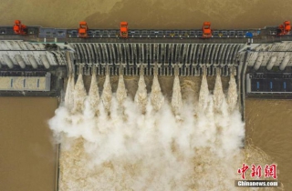 资料图:8月20日,75000立方米每秒的洪峰抵达三峡枢纽工程,三峡大坝开启11孔泄洪。 聂爽 摄