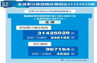 世卫组织网站最新数据显示,截至欧洲中部时间23日16时47分(北京时间22时47分),全球确诊病例较前一日增加246165例,达到31425029例;死亡病例增加4520例,达到967164例。