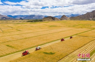 资料图:村民利用收割机收青稞。 (无人机拍摄) 中新社记者 何蓬磊 摄