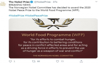 中新网10月9日电 据诺贝尔奖官网消息,当地时间10月9日,2020年诺贝尔和平奖揭晓,奖项被授予联合国世界粮食计划署(WFP),以表彰其“在对抗饥饿问题上所做的努力,为改善遭受冲突影响地区的和平条件所作的贡献,以及其在防止将饥饿问题作为战争和冲突的武器方面,发挥的推动作用”。