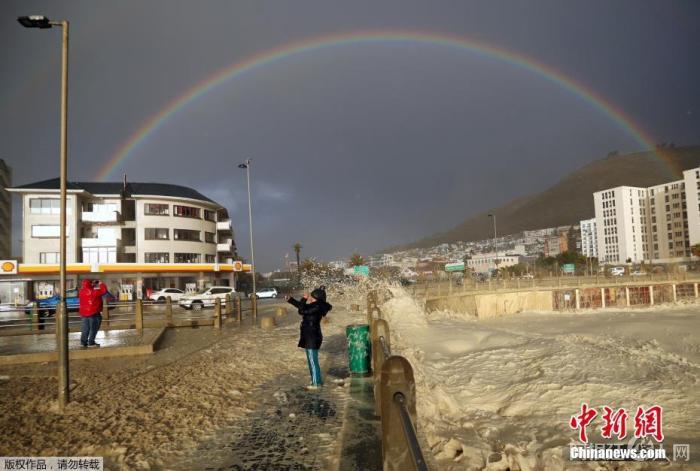 2020年7月13日,疫情期间,南非开普敦海岸边出现彩虹和大量泡沫,人们拍照留念。