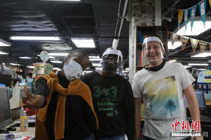 资料图:5月1日,南非正式将针对新冠疫情的封锁等级调低至第四级。图为约翰内斯堡一书店内,“全副武装”的店员们迎接书店重新开业。中新社记者 王曦 摄
