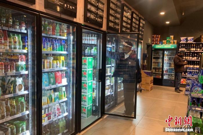 当地时间7月22日,南非约翰内斯堡,一家酒类商店的店员佩戴面罩整理冰箱内的货物。 中新社记者 王曦 摄