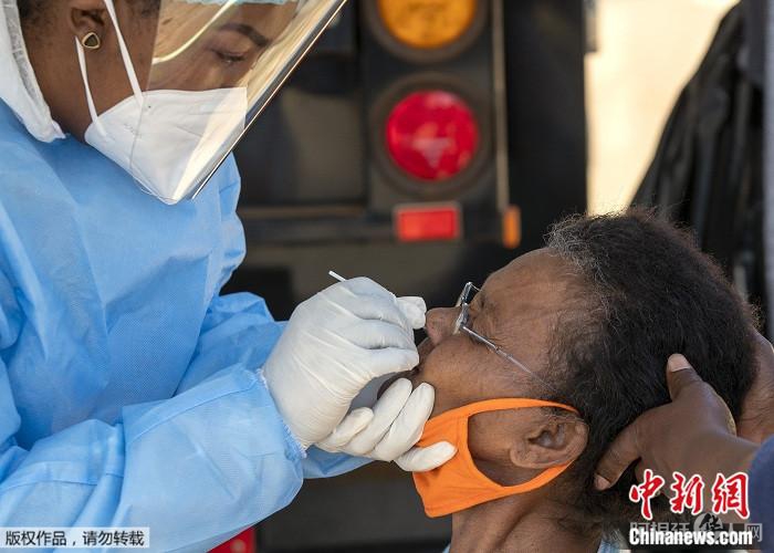资料图:2020年8月3日,在南非约翰内斯堡郊外的埃尔多拉多公园,一名卫生工作者正在对一名女性采样,以进行新冠病毒检测。