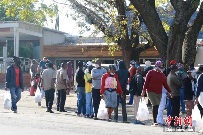 资料图:进入6月以来,南非新冠疫情呈快速增长态势。图为约翰内斯堡一社会救济站,低收入民众领取政府发放的救济食品。 中新社记者 王曦 摄