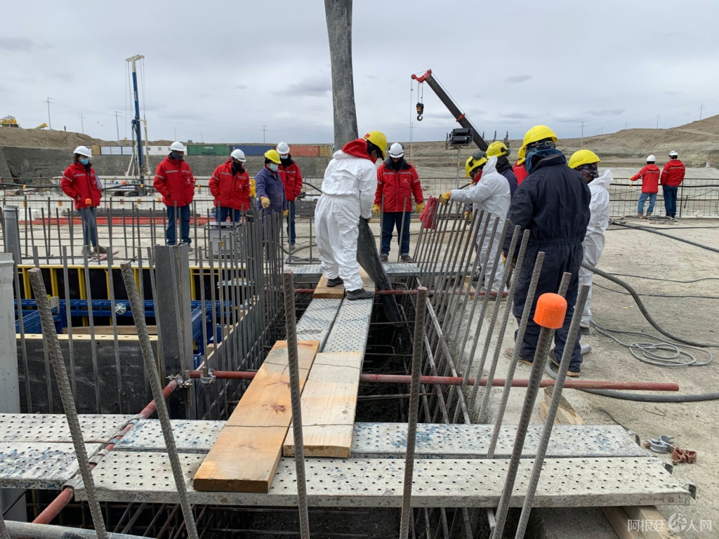 9月29日,在阿根廷圣克鲁斯省,工人在拉巴朗科萨水电站厂房进行混凝土浇筑。
