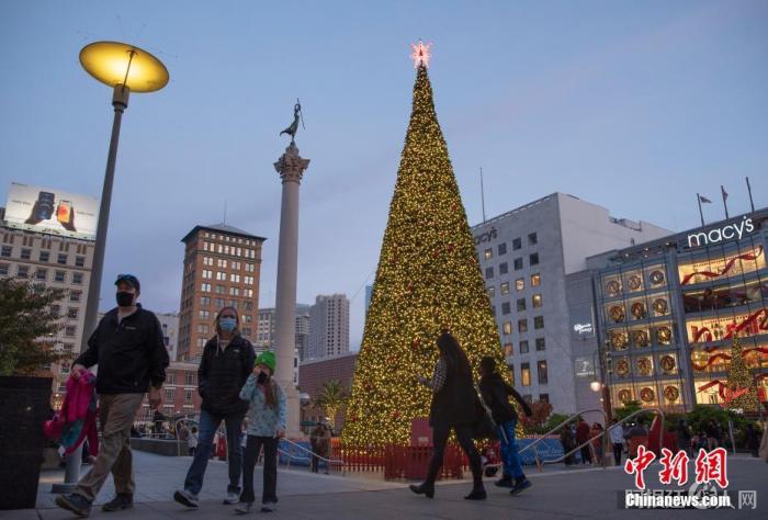 当地时间11月21日,美国旧金山市民从联合广场的圣诞树前经过。这棵高度超过25米的圣诞树装饰有超过33000盏节能LED灯和1100件装饰品。受新冠肺炎疫情影响,今年的圣诞树亮灯仪式日前以简单的方式举行。 中新社记者 刘关关 摄