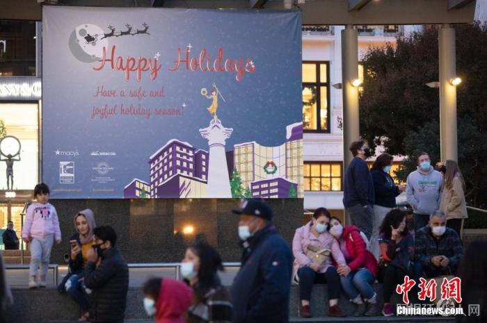 当地时间11月21日,美国加州旧金山市民在联合广场上一块写着“假期快乐”的广告牌前休息。 中新社记者 刘关关 摄