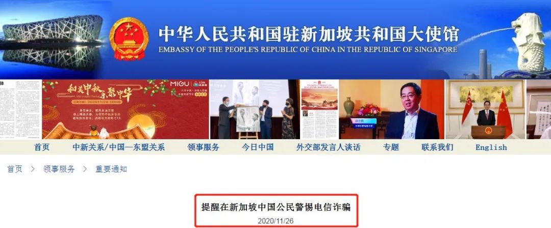 驻新加坡大使馆提醒在新中国公民警惕电信诈骗