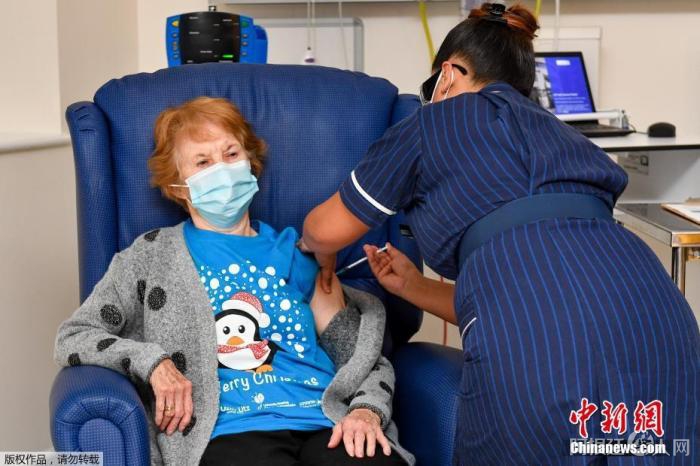 12月8日,90岁的英国女士玛格丽特 基南接种了由辉瑞公司生产的新冠疫苗,成为除临床试验外,世界上首位接种该款疫苗的人。