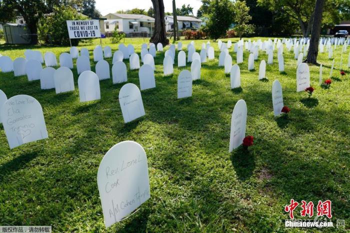 当地时间10月14日,美国迈阿密自由城附近的西蒙霍夫花卉公园摆满墓碑形的白色塑料牌纪念新冠逝者,塑料牌上的留言引人泪目。