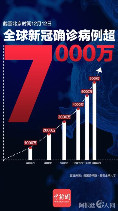 中新网12月12日电(陈爽 刘淙)短短16天,又激增10000000!北京时间12月12日,美国约翰斯 霍普金斯大学数据显示,全球累计新冠确诊病例超7000万。