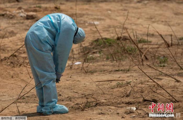 4月29日,在印度新德里一处埋葬新冠死者的墓地里,一名医护人员弯下了腰。