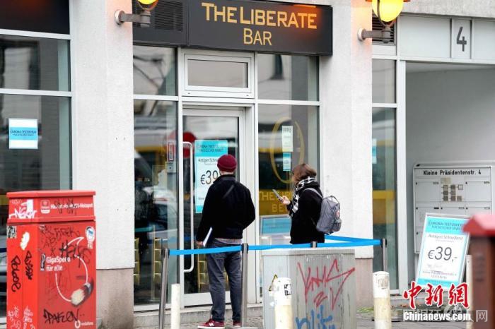 资料图:人们在柏林一家酒吧改成的新冠抗原快速检测点外等候检测。中新社记者 彭大伟 摄