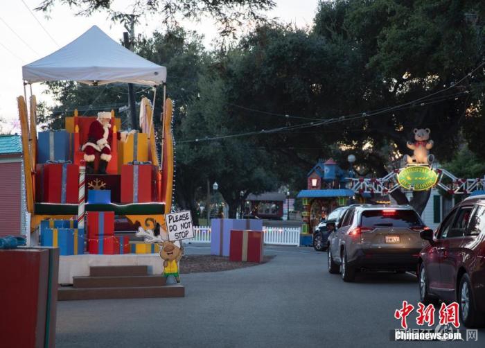 资料图:当地时间12月21日,民众在美国加州圣荷西历史公园以“得来速”的方式参观“公园里的圣诞节”圣诞主题装饰展。中新社记者 刘关关 摄