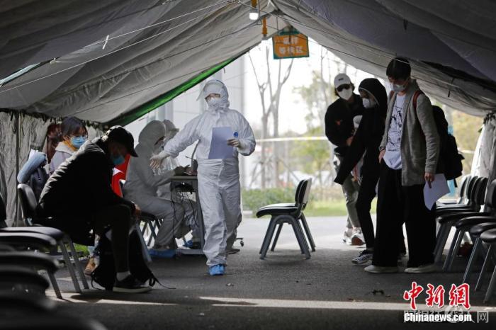 资料图:3月19日,在上海市长宁区的“集中留验点”,工作人员引导入境人员进行核酸测试。 中新社记者 殷立勤 摄