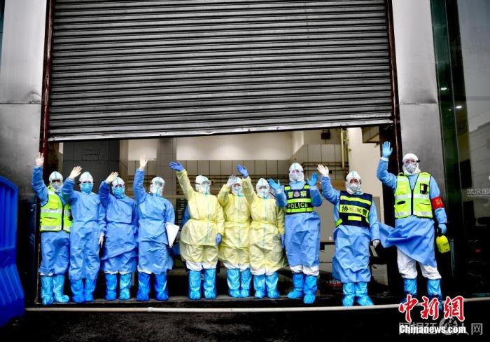 资料图:方舱医院的医护人员向治愈患者挥手告别。中新社记者 安源 摄
