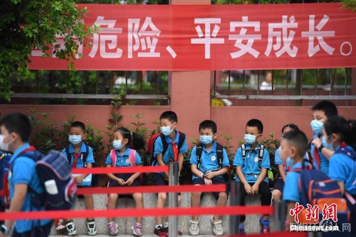 资料图:9月1日,重庆市大渡口区双山实验小学的学生们戴着口罩有序进入校园。 中新社记者 陈超 摄