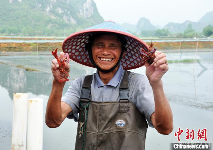 在广西南宁市上林县三里镇小龙虾水产健康养殖示范场,农民展示捕获的小龙虾。 黄艳梅 摄