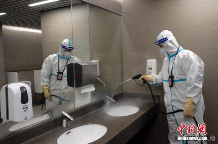 资料图:工作人员在广州白云国际机场二号航站楼国际区域卫生间使用高温消杀新设备。中新社记者 姬东 摄