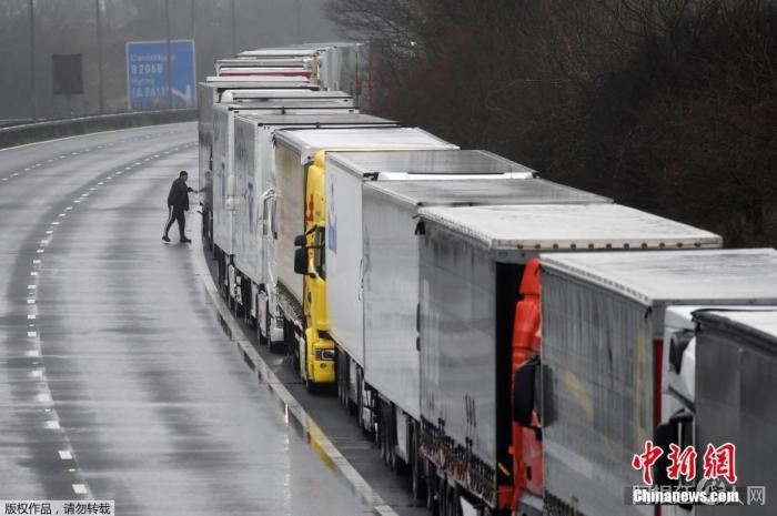 当地时间12月21日,欧盟多国对英实施交通封锁,英国无法出境的长途卡车排起长队。