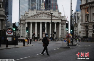 资料图:当地时间1月5日,英国采取了第三次严格性封锁措施,伦敦街头行人稀少。图为一名行人穿过英国皇家交易所前的街道。