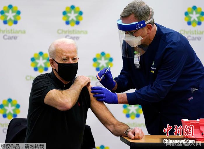当地时间1月11日,美国当选总统拜登在特拉华州克里斯蒂安娜医院公开接种了第二剂新冠疫苗。
