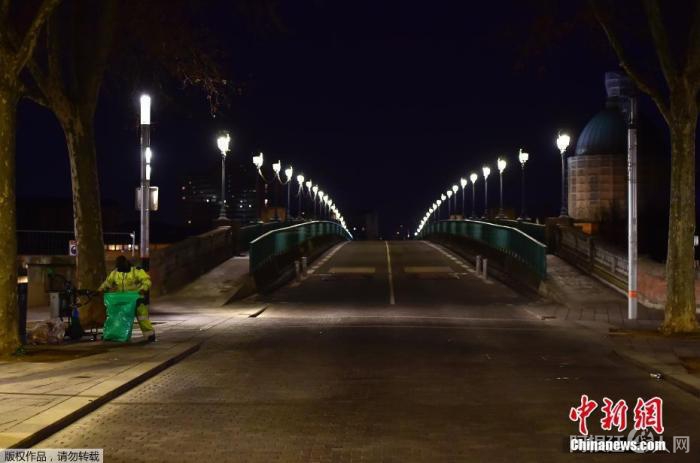 资料图:当地时间1月16日,法国全境正式延长宵禁时段,每日宵禁时段自10小时延长至12小时。图为法国图卢兹,一名市政工作人员在圣皮埃尔桥附近清空公共垃圾箱。