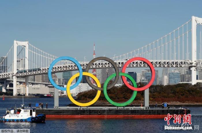资料图:当地时间2020年12月1日,日本东京,正在用船运输的奥运五环标志,时隔4个月的安全检查和维修后,它重新回到东京湾上。