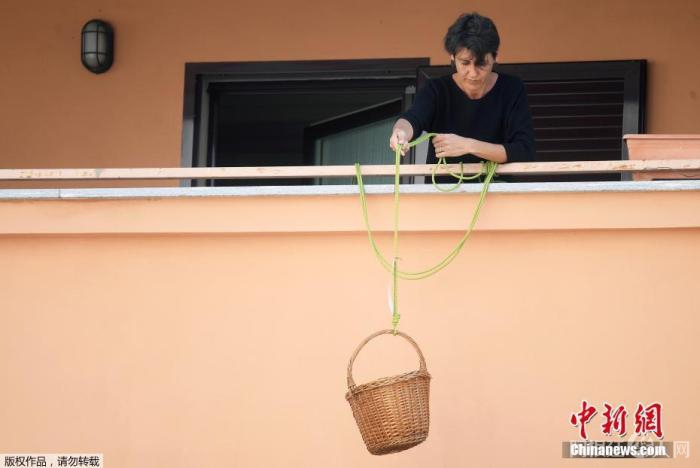 2020年4月9日,封城”中意大利民众吊篮捐赠食物。