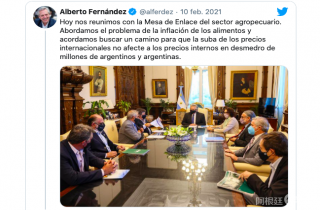 当天午夜前,费尔南德斯通过社交网络发文表示:“我们今天同农业领域联络委员会举行了会晤,解决了食品通胀问题,同时双方同意努力寻求国际粮食价格上涨时不影响国内价格的解决之道,以免损害到成百上千万阿根廷民众的利益。”