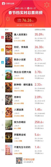 截至2月17日,2021年春节档总票房已超过75亿元,创下春节档票房记录,被称为史上最牛春节档。