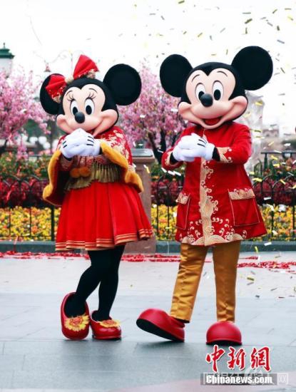 2月12日,“米奇”和“米妮”首次身着由设计师特别定制的新春盛装,亮相上海迪士尼乐园。中新社记者 汤彦俊 摄