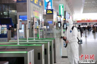 长三角铁路迎返程客流高峰 工作人员在上海虹桥站对候车大厅进行常规消毒。 赵金爱 摄