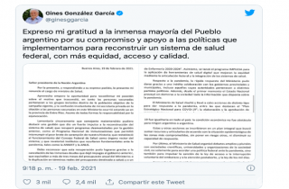 冈萨雷斯表示:“在此对绝大多数阿根廷民众表达感谢,感谢你们对重建平等、可获取及有质量卫生系统政策的承诺和支持。”